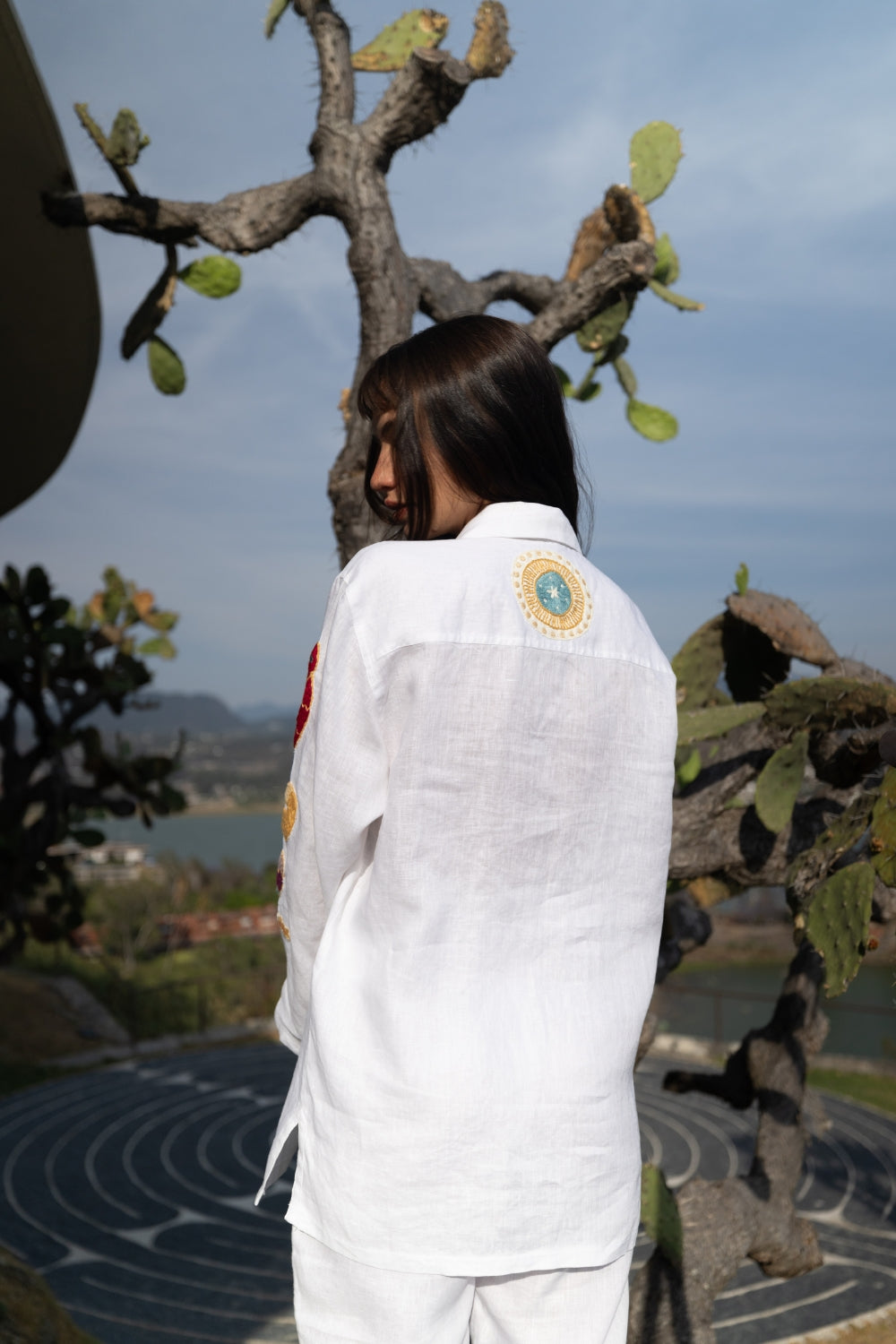 Long-sleeved shirt, made entirely of linen with hand-embroidered appliqués from our Huichol embroidery series. A classic shirt transformed into art.