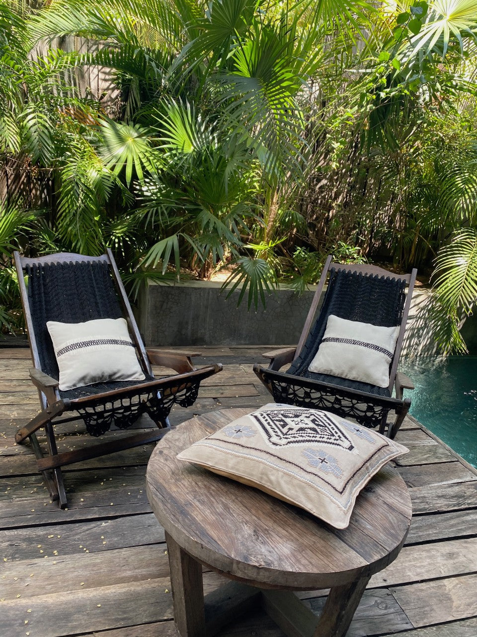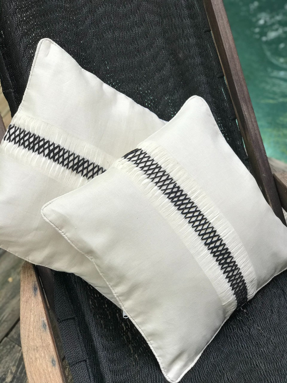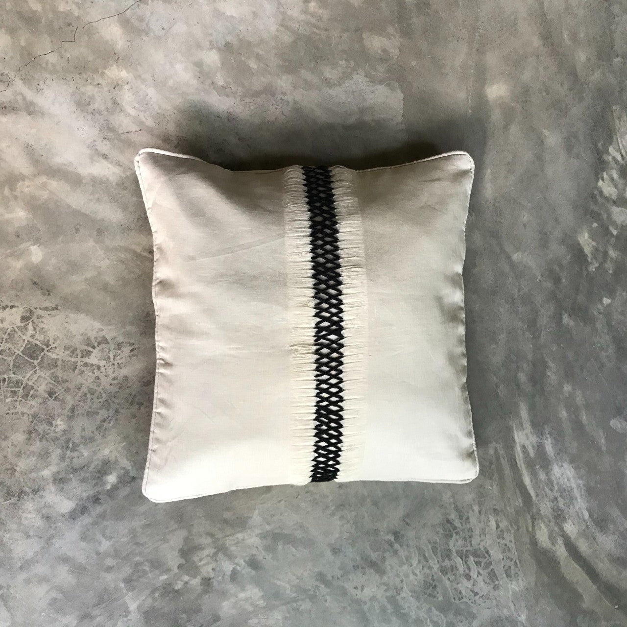 The Deshilado cushion, made from fine linen with a minimalist design in the center, uses a unique deshilado technique and braiding. This cushion will add a modern touch to any room.