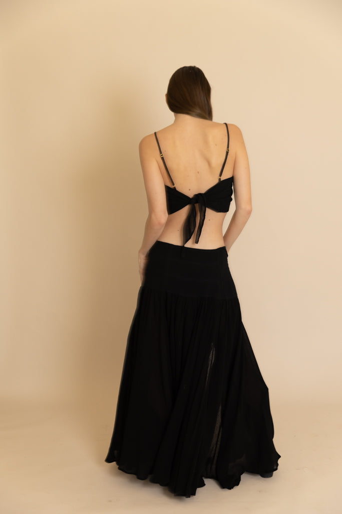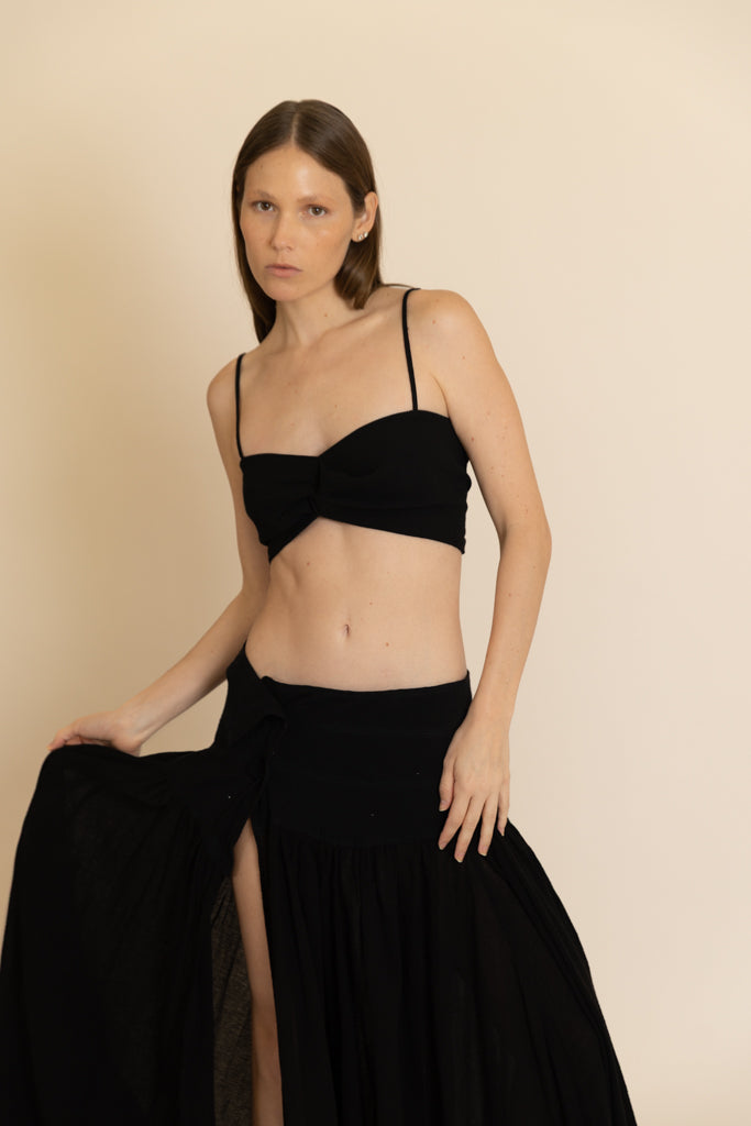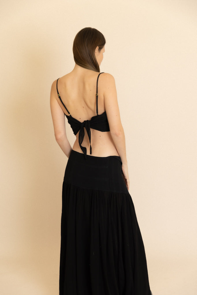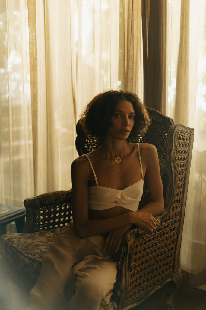 Ligero y delicado, diseñado para enmarcar el torso con naturalidad. El fruncido central y los tirantes finos generan una silueta femenina que se adapta mediante amarre posterior.