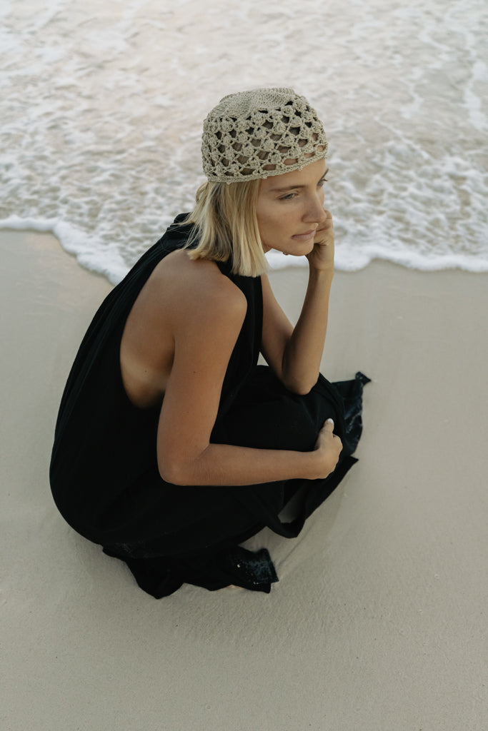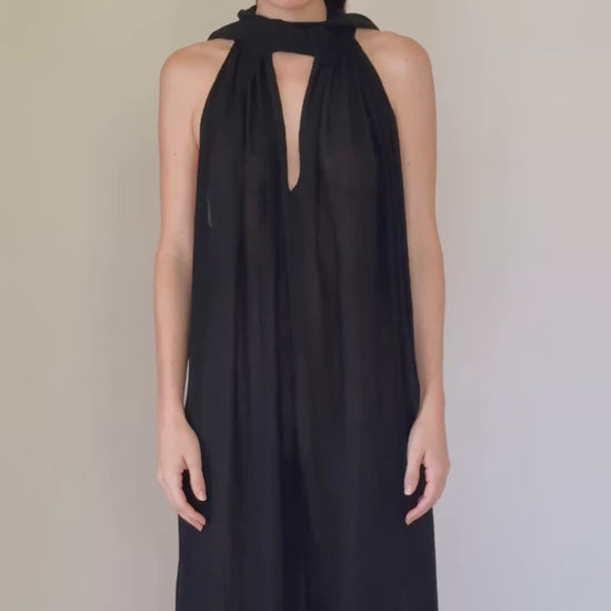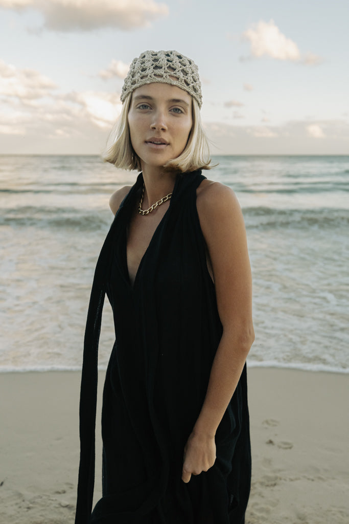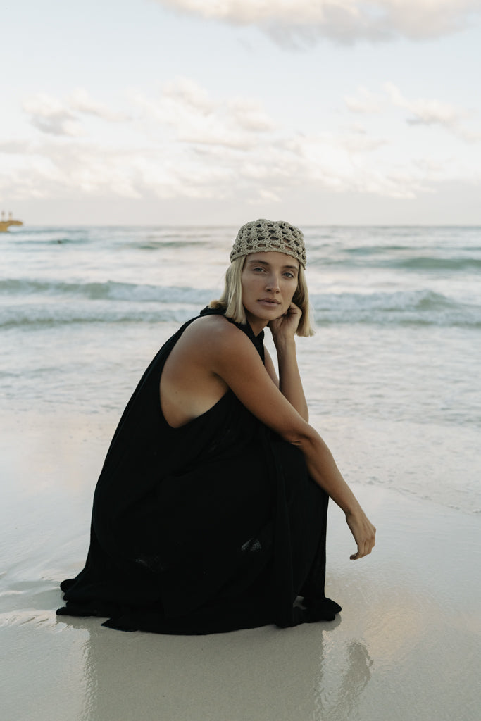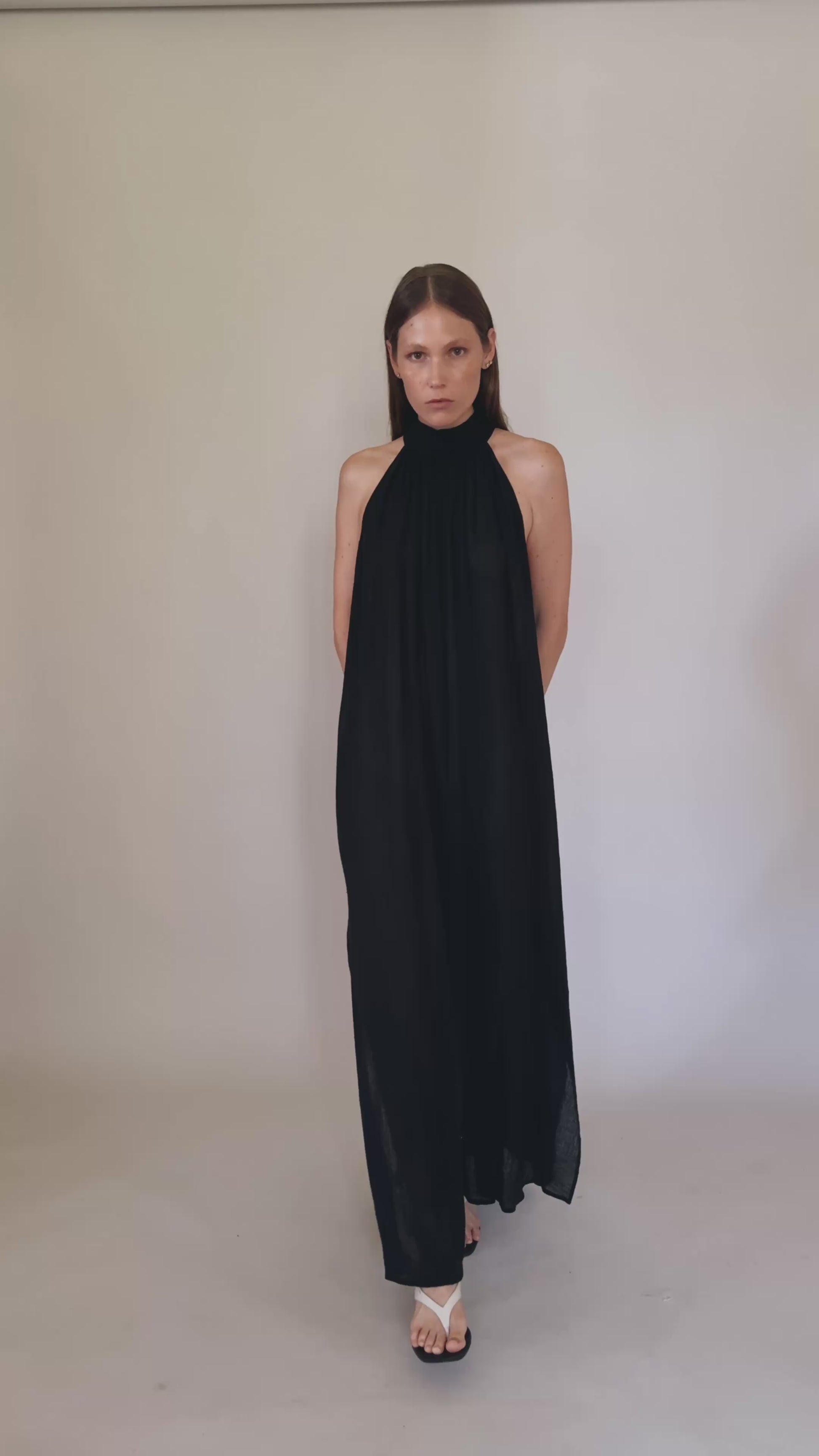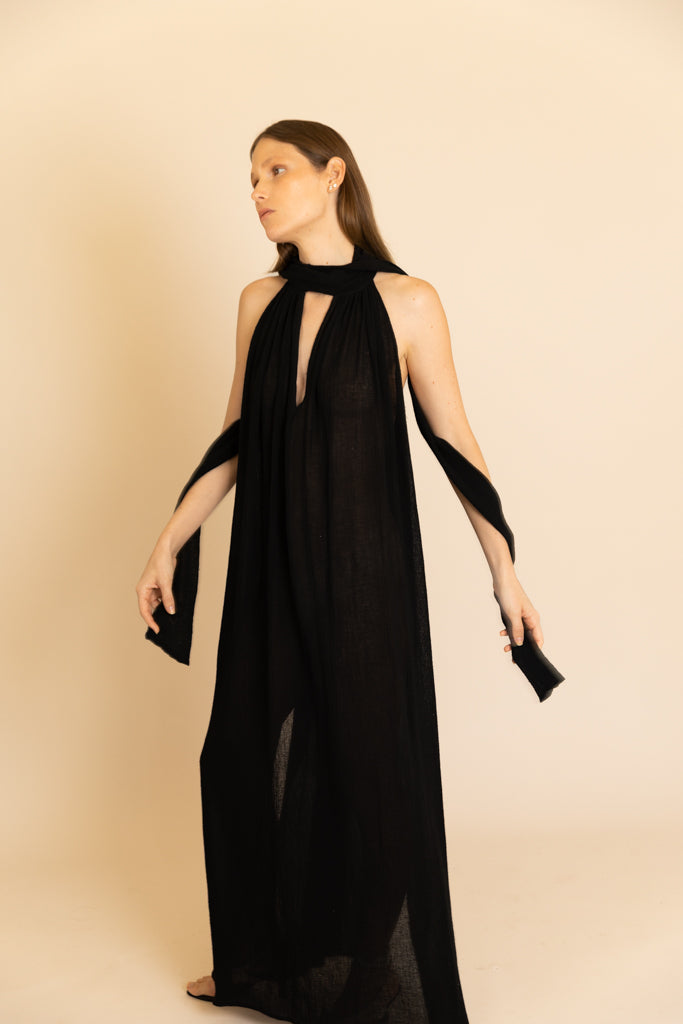Un vestido que se mueve con ligereza y naturalidad, pensado para climas cálidos y momentos sin prisa. Su silueta halter enmarca los hombros mientras la espalda parcialmente descubierta aporta frescura y sofisticación.