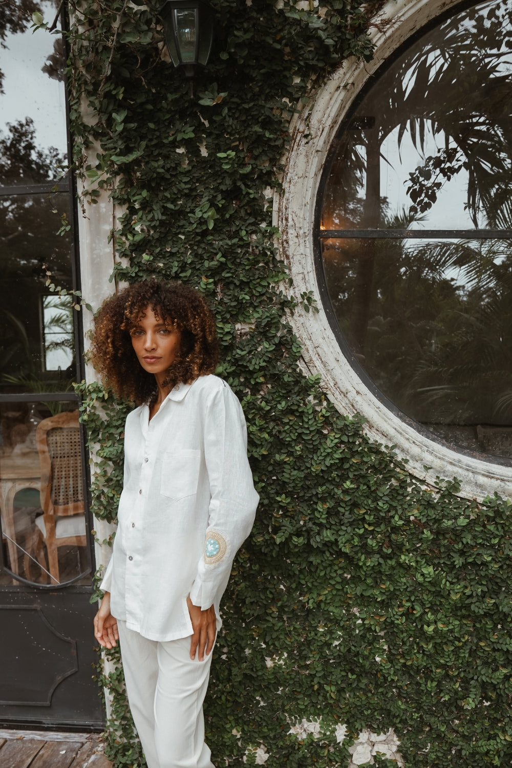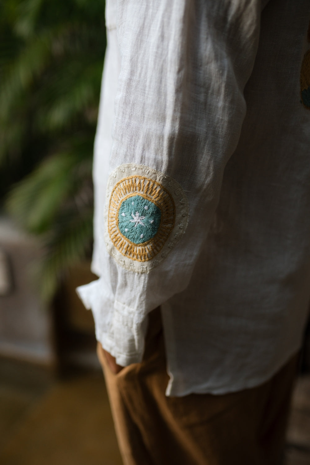 Camisa de mangas largas , confeccionada completamente en Lino con apliques bordados a mano de nuestra serie de bordados que pertenecen a la colección huichol. Una camisa clásica transformada en arte.